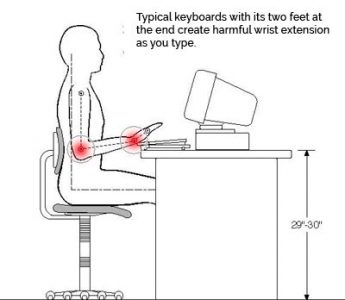 Mặc dù việc dựng chân bàn phím giúp bạn dễ dàng nhìn và chạm tới các phím phía sau, nhưng chúng có một khuyết điểm lớn: chúng tạo ra một góc dốc dương. Điều này buộc cổ tay của bạn vào một vị trí đánh máy không tự nhiên khi chúng bị nghiêng về phía sau. Điều này được gọi là mở rộng cổ tay và theo thời gian có thể gây tổn thương thần kinh và thậm chí là CTS.