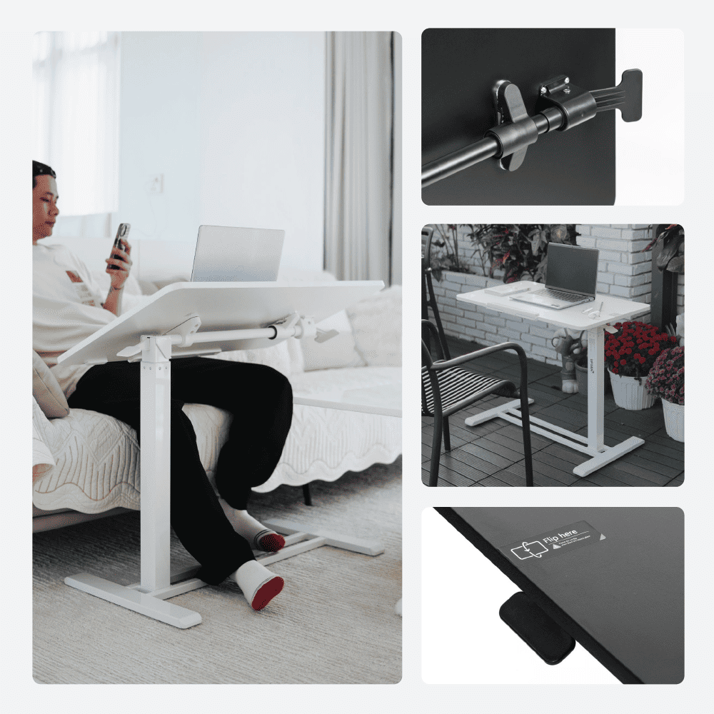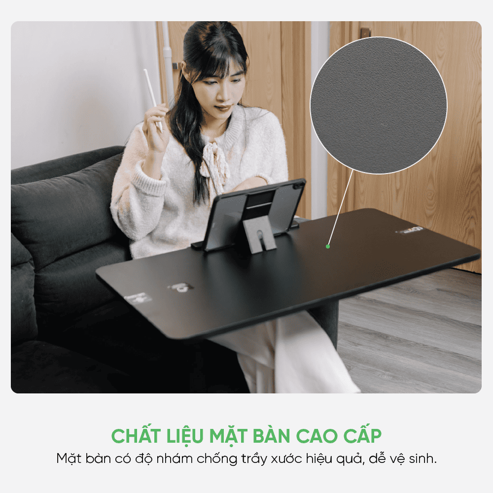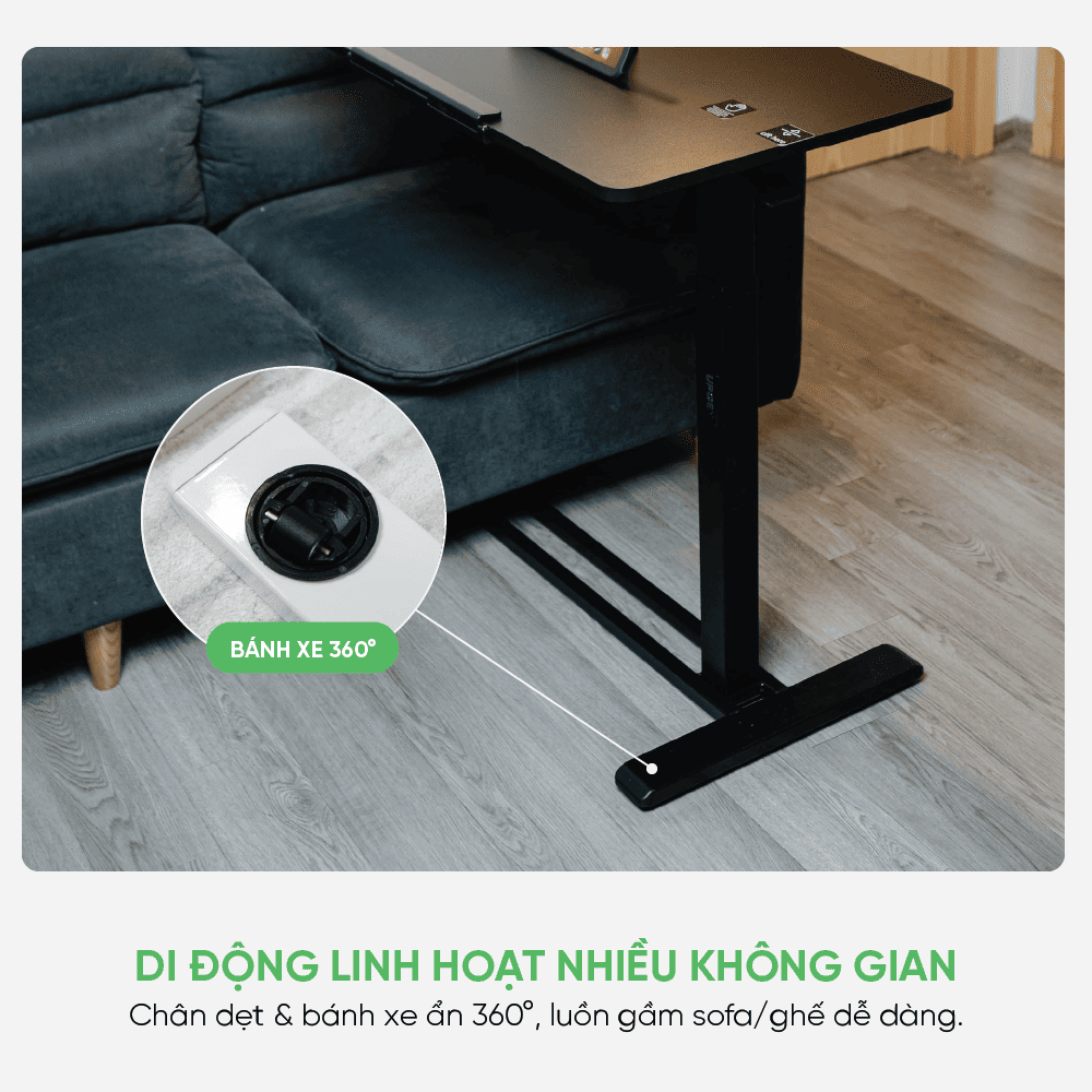 Thiết kế chân dẹt giúp bàn dễ dàng luồn vào gầm sofa hoặc gầm ghế mà không vướng víu. Hệ thống bánh xe ẩn xoay 360° hỗ trợ di chuyển nhẹ nhàng giữa các khu vực khác nhau trong nhà. Người dùng có thể thay đổi vị trí làm việc nhanh chóng theo nhu cầu, mang lại trải nghiệm sử dụng thuận tiện trong không gian sống hiện đại.