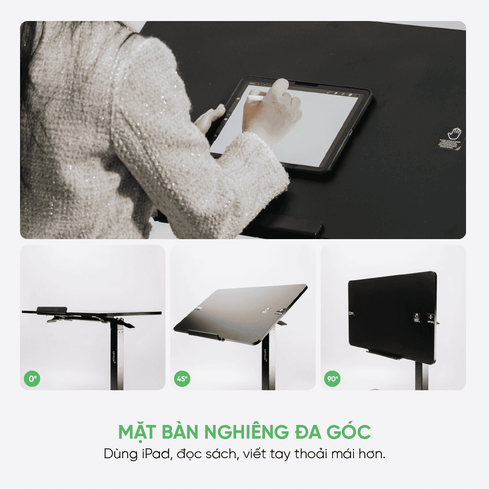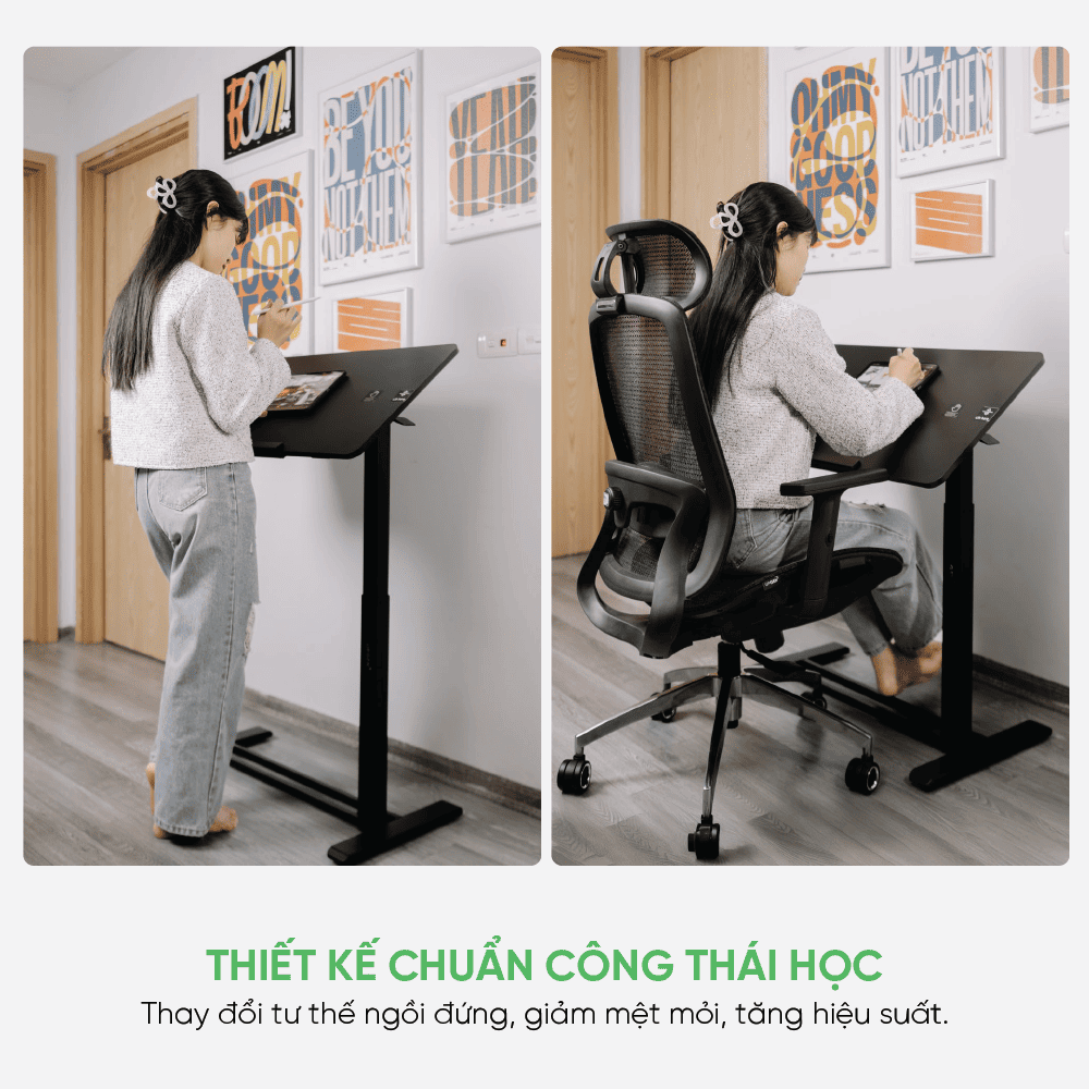 Cấu trúc bàn được xây dựng theo nguyên lý công thái học, cho phép người dùng chuyển đổi linh hoạt giữa tư thế ngồi và đứng. Việc thay đổi tư thế thường xuyên giúp giảm áp lực lên cột sống, hạn chế cảm giác mỏi lưng và căng cơ khi làm việc kéo dài. Nhờ đó, khả năng tập trung và hiệu suất làm việc cũng được cải thiện đáng kể. Sản phẩm phù hợp cho cả người làm việc tại nhà lẫn môi trường văn phòng chuyên nghiệp.