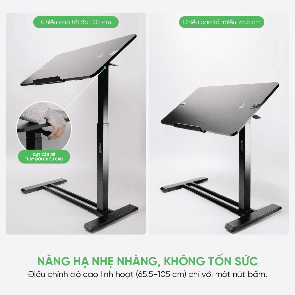Bạn có thể điều chỉnh chiều cao bàn trong khoảng 65.5-105 cm thông qua thao tác gạt cần đơn giản. Cơ chế vận hành mượt mà giúp thay đổi độ cao nhanh chóng mà không đòi hỏi nhiều lực tác động. Mức thấp nhất 65.5 cm phù hợp khi ngồi làm việc, còn 105 cm là độ cao lý tưởng cho tư thế đứng. Khi sử dụng, người dùng có thể dùng một cách thuận tiện, đáp ứng đa dạng vóc dáng và nhu cầu người dùng.