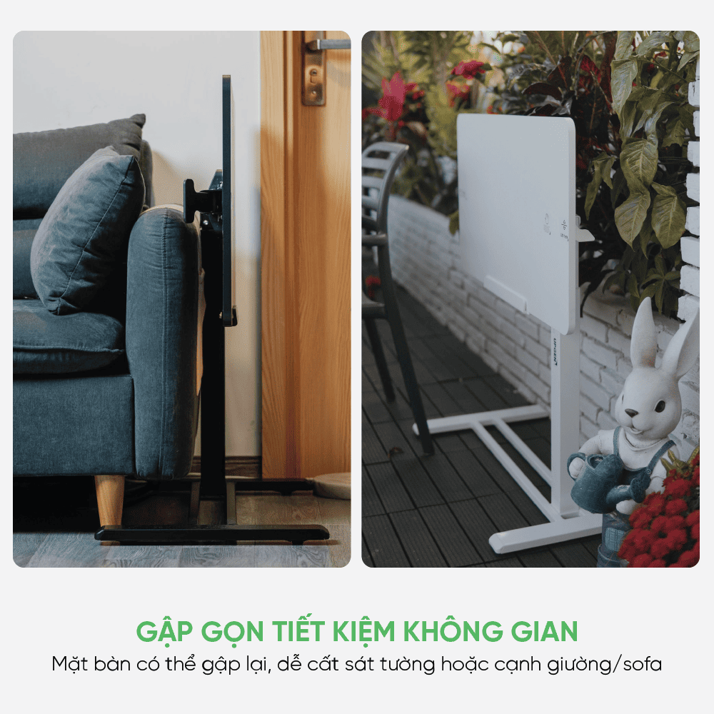 Phần mặt bàn được thiết kế có thể gập lại khi không sử dụng, giúp tối ưu diện tích đáng kể. Người dùng có thể dễ dàng đặt bàn sát tường, cạnh sofa hoặc cạnh giường ngủ một cách gọn gàng. Tính năng này đặc biệt hữu ích với căn hộ nhỏ hoặc không gian cần sự linh hoạt cao, là giải pháp tối ưu dành cho những ai ưu tiên sự ngăn nắp và tinh giản.