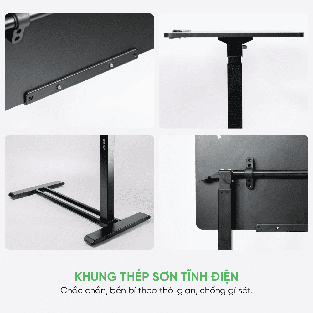 Phần khung được chế tạo từ thép chất lượng cao và phủ lớp sơn tĩnh điện bền bỉ. Cấu trúc vững chắc giúp bàn ổn định trong quá trình nâng hạ và sử dụng hàng ngày. Lớp sơn hoàn thiện không chỉ tăng tính thẩm mỹ mà còn hỗ trợ chống oxy hóa và gỉ sét, đảm bảo độ bền và sự ổn định lâu dài theo thời gian.