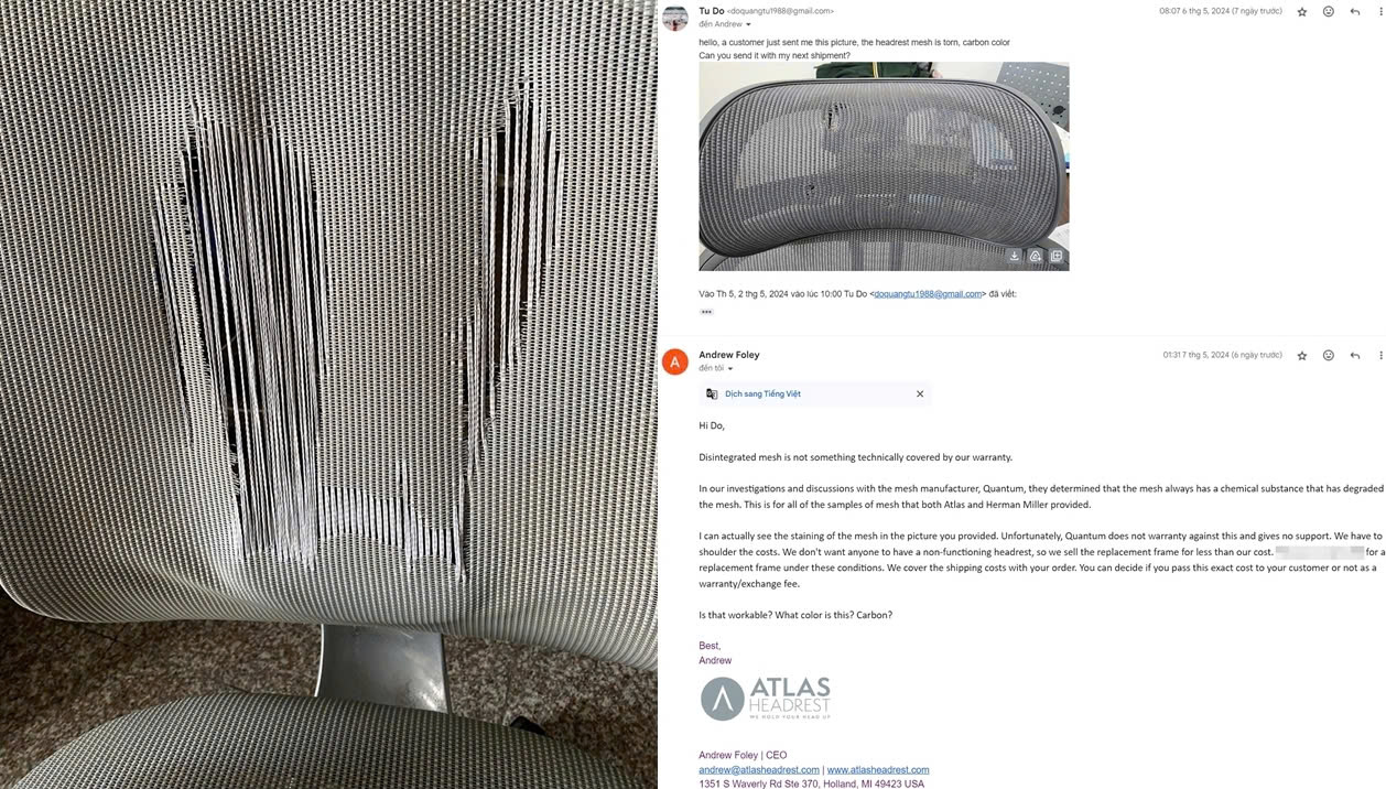 - Ảnh phải: Tựa đầu Atlas chính hãng – made in USA bị rách do mồ hôi thấm vào lâu ngày. CEO của Atlasheadrest.com là Adrew Foley đã trả lời với những lỗi thế này thì sẽ không được bảo hành mà phải mua bộ phận thay thế mới.