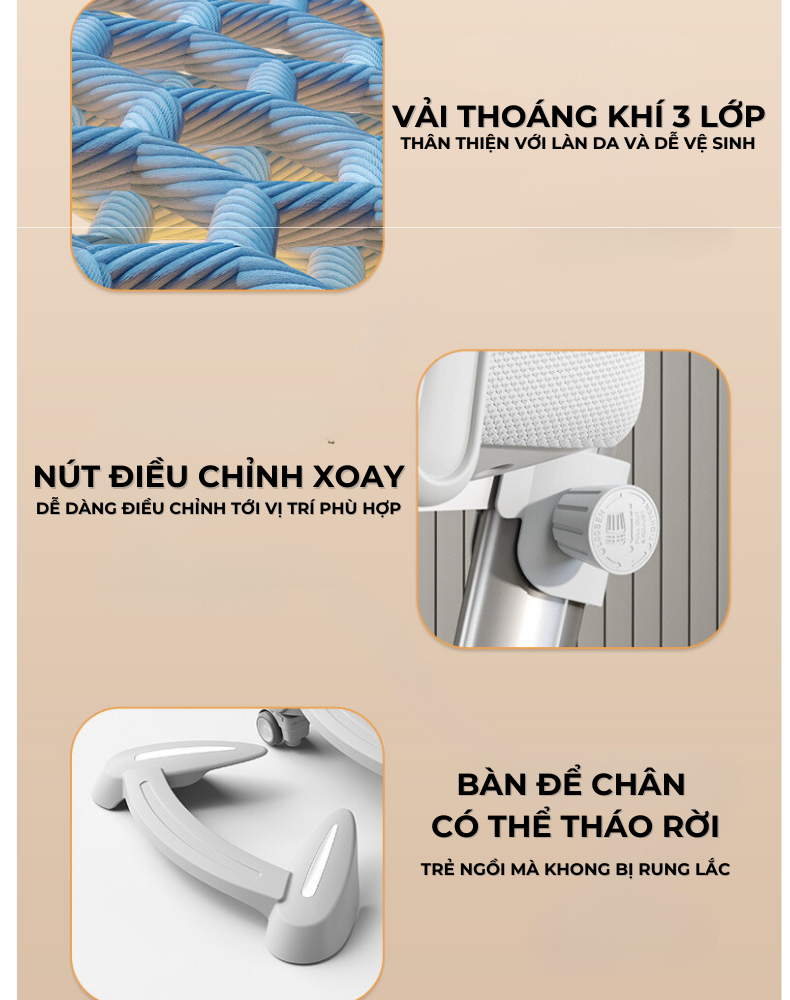 Nhờ vào đệm cao su êm ái và độ bền bỉ, ghế trẻ em ErgoKids không chỉ là một sản phẩm tạo sự thoải mái mà còn là một công cụ hỗ trợ quan trọng trong việc duy trì sức khỏe của cột sống của trẻ.