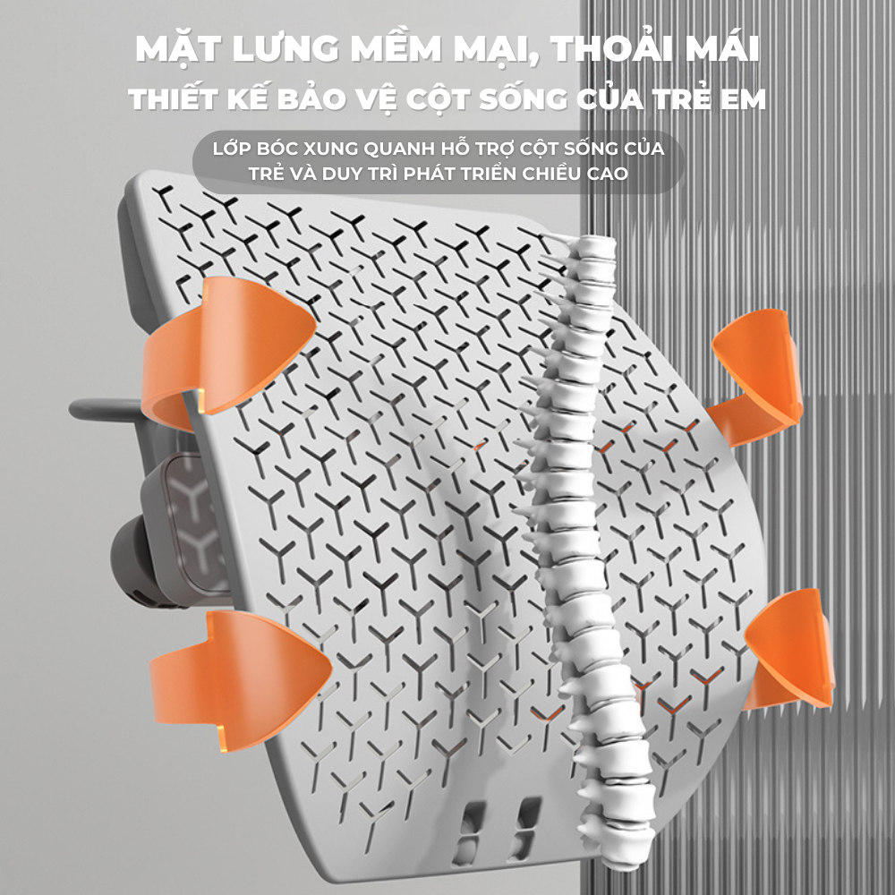 Mặt đệm rộng của ghế cho phép trẻ dễ dàng điều chỉnh vị trí đùi, đảm bảo tư thế ngồi đúng và thoải mái. Điều này không chỉ giúp trẻ phát triển một thói quen ngồi đúng, mà còn bảo vệ cột sống của họ khỏi tác động tiêu cực do việc ngồi sai tư thế. Khả năng sử dụng lâu dài của sản phẩm đồng nghĩa với việc cơ thể trẻ có thể phát triển mà không cần lo lắng về việc thay đổi ghế khi trẻ lớn lên.