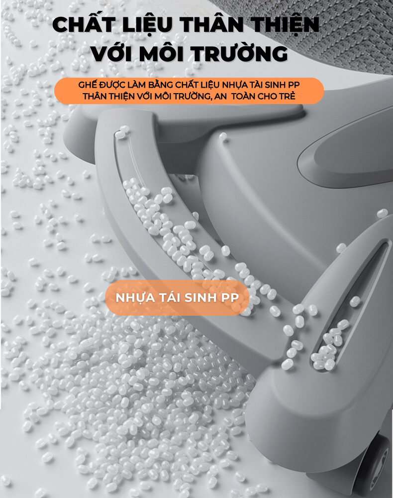 Ghế trẻ em ErgoKids không chỉ xuất sắc về thiết kế và tính năng mà còn đảm bảo sự thân thiện với môi trường. Chất liệu chính sử dụng trong sản xuất ghế ErgoKids là nhựa tái sinh Polypropylene (PP), một loại nhựa có khả năng tái chế cao. Điều này đồng nghĩa rằng sản phẩm không chỉ đáp ứng nhu cầu của trẻ em và phụ huynh, mà còn góp phần vào bảo vệ môi trường bằng cách sử dụng lại tài nguyên nhựa đã được tái sinh.