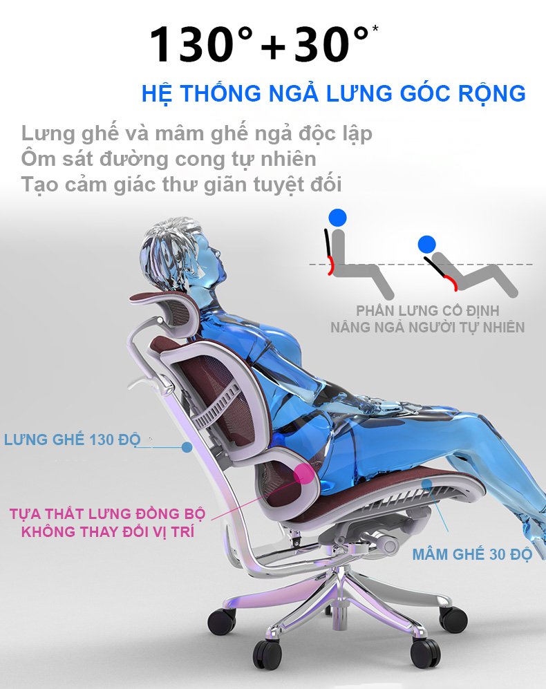 | Độ ngả | 130 độ | Mâm ghế | Di chuyển ra vào 5cm | ||