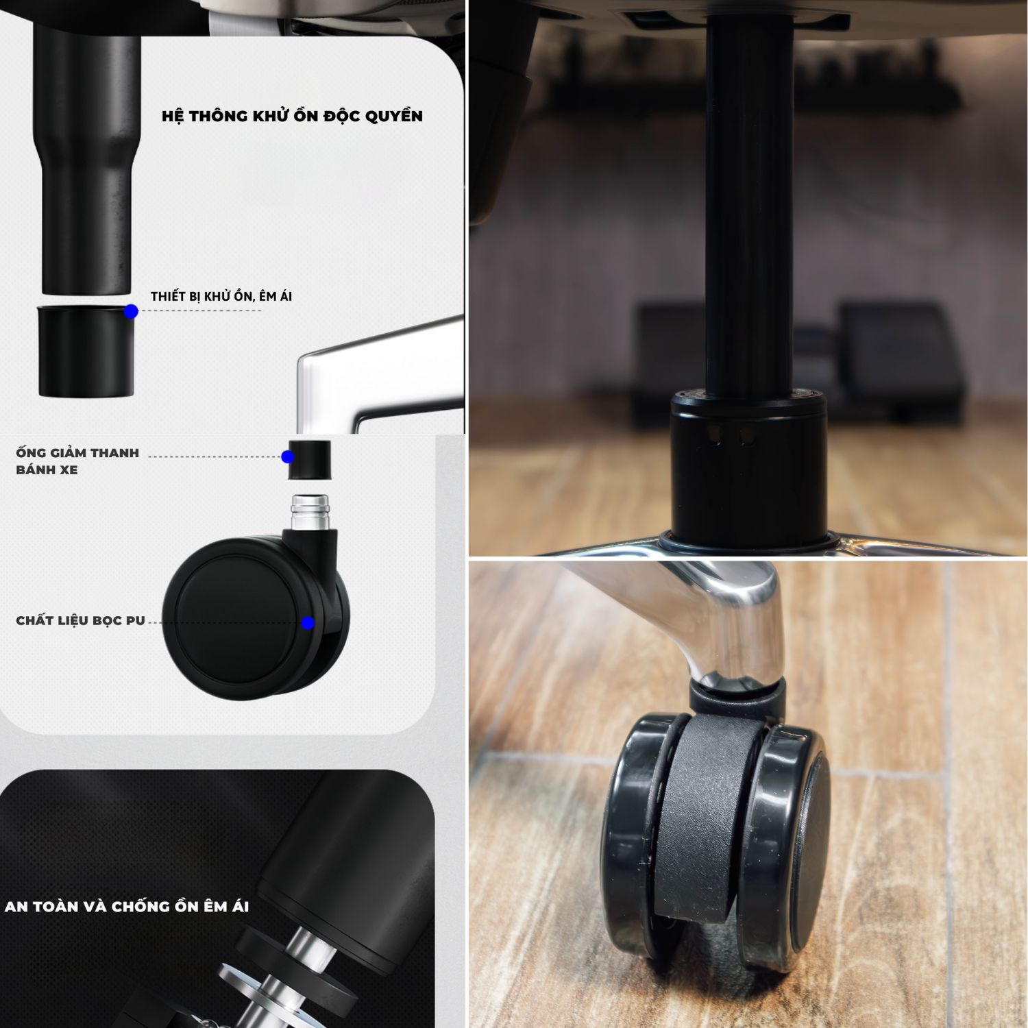 Hệ thống giảm thanh tại ống dẫn bánh xe được thiết kế để giảm tiếng ồn tạo ra khi ghế di chuyển trên mặt sàn. Điều này tác động tích cực đến không gian làm việc, giúp người sử dụng tập trung và làm việc hiệu quả hơn.