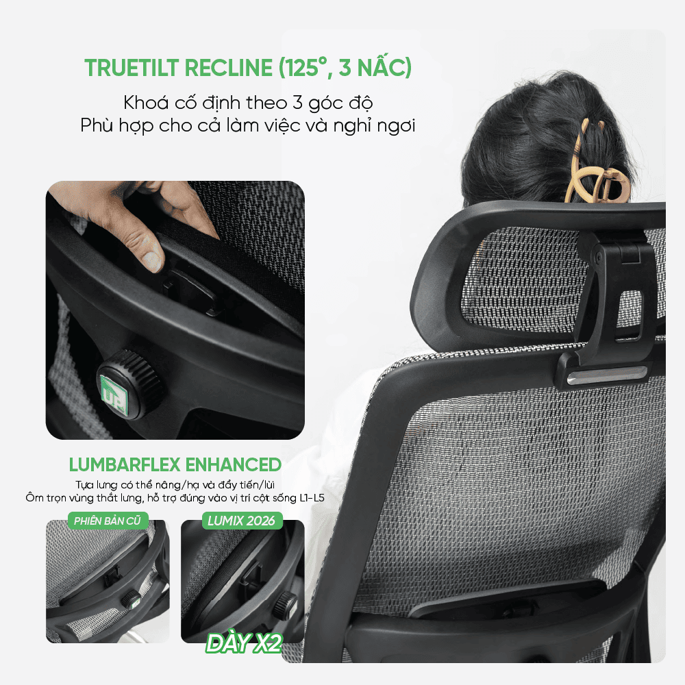 Lumix 2026 được trang bị cơ chế ngả lưng TrueTilt với khả năng điều chỉnh tối đa 125° và khóa cố định ở 3 vị trí khác nhau. Tính năng này cho phép người dùng linh hoạt chuyển đổi giữa tư thế làm việc và thư giãn chỉ trong vài thao tác đơn giản. Khi cần tập trung, ghế giữ tư thế ổn định; khi muốn nghỉ ngơi, lưng ghế có thể ngả ra nhẹ nhàng. Nhờ vậy, trải nghiệm sử dụng trở nên thoải mái và tự nhiên hơn trong suốt ngày dài làm việc.