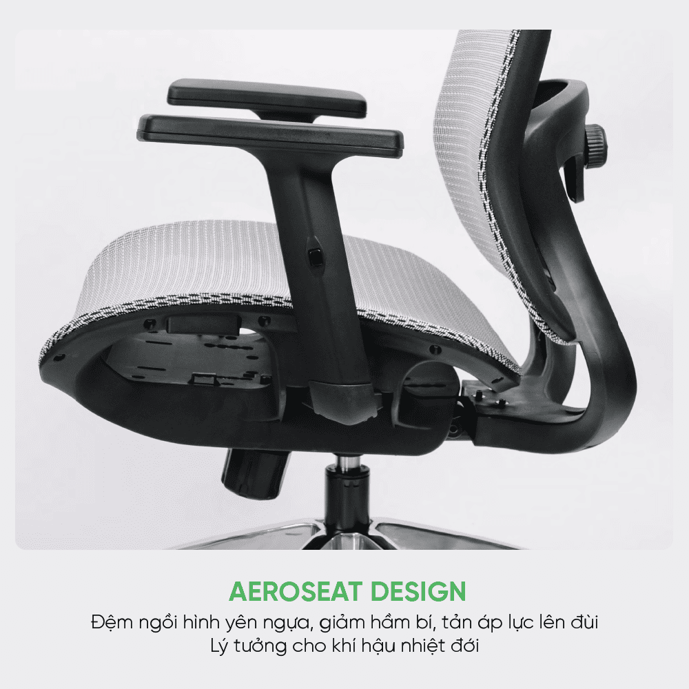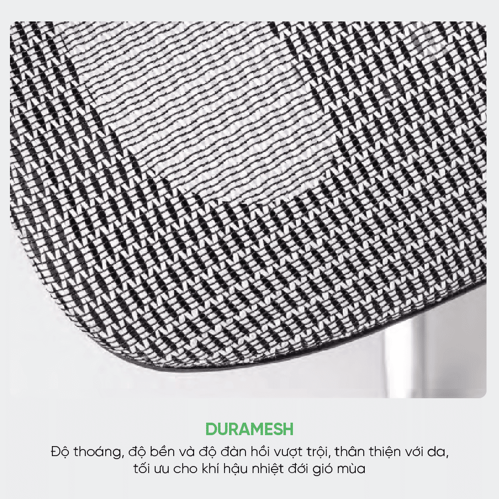 Ghế sử dụng chất liệu lưới DuraMesh cao cấp với độ bền và độ đàn hồi vượt trội. Cấu trúc lưới giúp không khí lưu thông tốt, mang lại cảm giác thoáng mát trong quá trình sử dụng. Bề mặt lưới thân thiện với da, hạn chế cảm giác nóng hoặc bí khi ngồi lâu. Đây là chất liệu đặc biệt phù hợp với điều kiện khí hậu nhiệt đới nóng ẩm.