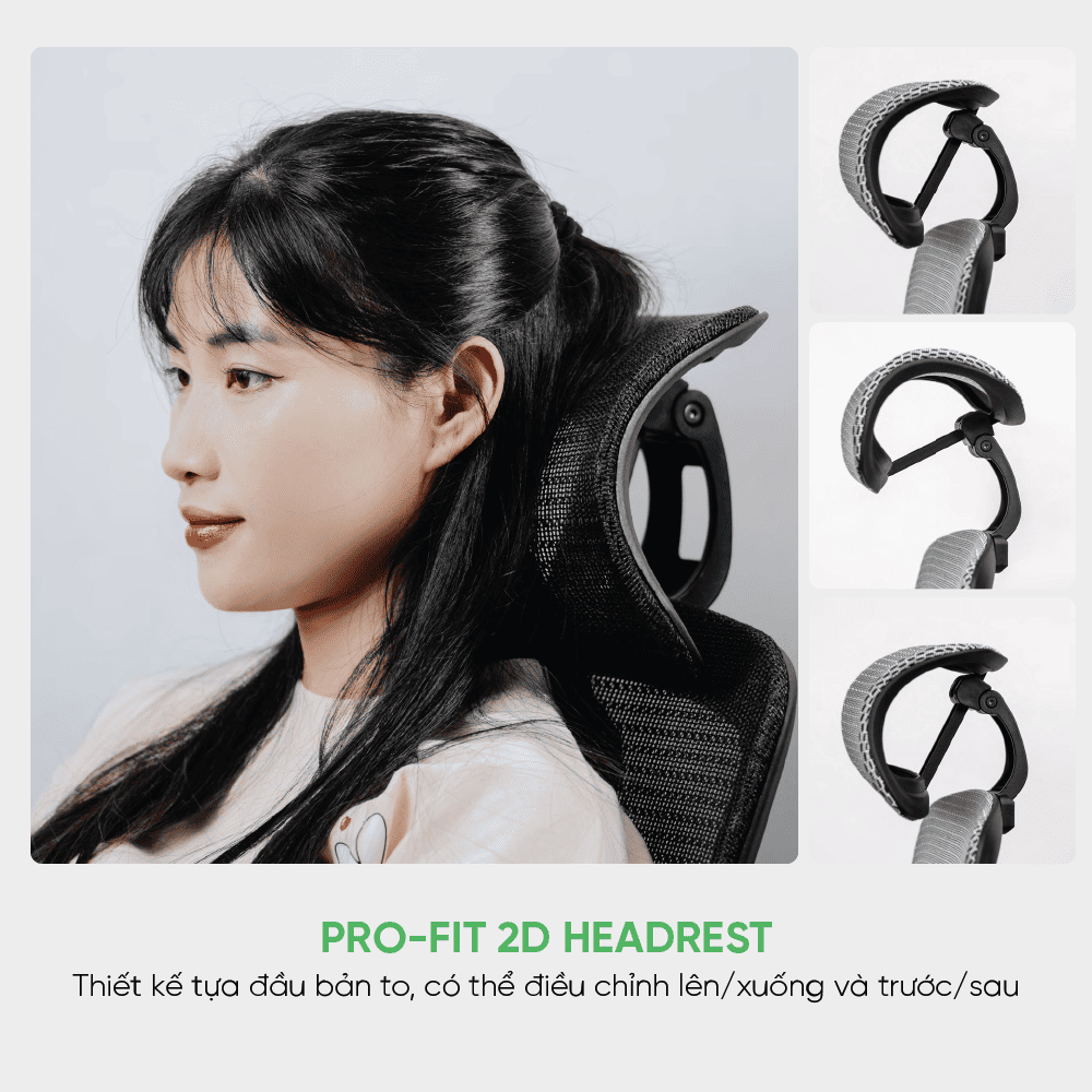 Tựa đầu Pro-Fit 2D được thiết kế với kích thước lớn hơn, giúp nâng đỡ tốt vùng cổ và đầu. Người dùng có thể điều chỉnh độ cao cũng như khoảng cách trước – sau để phù hợp với tư thế ngồi. Nhờ vậy, cổ và vai được hỗ trợ tốt hơn khi làm việc hoặc khi ngả lưng thư giãn. Đây là chi tiết quan trọng giúp hoàn thiện trải nghiệm công thái học của ghế.