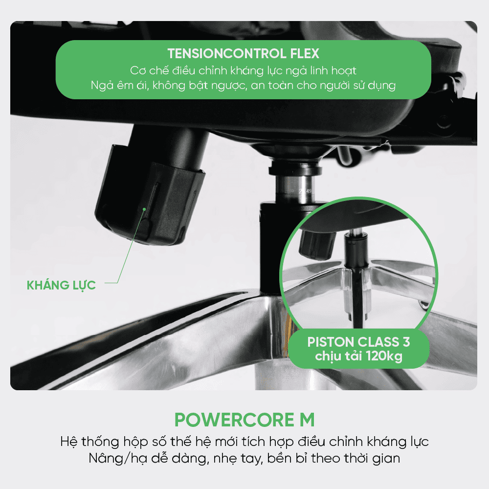 Lumix 2026 được trang bị hệ thống hộp số PowerCore M thế hệ mới, tích hợp khả năng điều chỉnh kháng lực khi ngả lưng. Cơ chế vận hành mượt mà giúp việc nâng hạ và điều chỉnh ghế trở nên nhẹ nhàng. Ngoài ra, ghế còn sử dụng piston Class 3 với khả năng chịu tải lên tới 120kg. Hệ thống TensionControl Flex giúp điều chỉnh lực ngả linh hoạt, mang lại cảm giác ngả êm và an toàn.