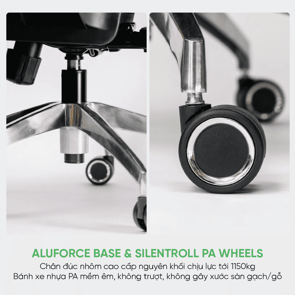 Phần chân ghế được đúc từ hợp kim nhôm cao cấp nguyên khối, đảm bảo độ chắc chắn và độ bền cao. Khả năng chịu lực của chân ghế lên tới 1150kg, mang lại sự ổn định khi sử dụng. Bánh xe SilentRoll làm từ nhựa PA giúp di chuyển nhẹ nhàng và hạn chế tiếng ồn. Đồng thời, bánh xe cũng không làm trầy xước bề mặt sàn gạch hoặc sàn gỗ.