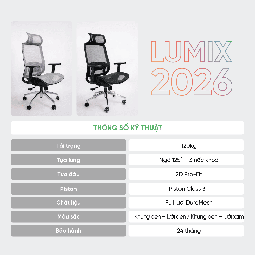 Thiết kế của Lumix 2026 mang phong cách hiện đại, tinh giản nhưng vẫn đảm bảo đầy đủ các tính năng công thái học cần thiết. Phần khung ghế được hoàn thiện chắc chắn, kết hợp cùng chất liệu lưới cao cấp mang lại cảm giác thoáng mát và dễ chịu khi sử dụng. Các chi tiết được bố trí hợp lý nhằm tối ưu khả năng điều chỉnh theo từng vóc dáng người dùng. Sự cân bằng giữa công năng và thẩm mỹ giúp chiếc ghế phù hợp với nhiều không gian làm việc khác nhau.