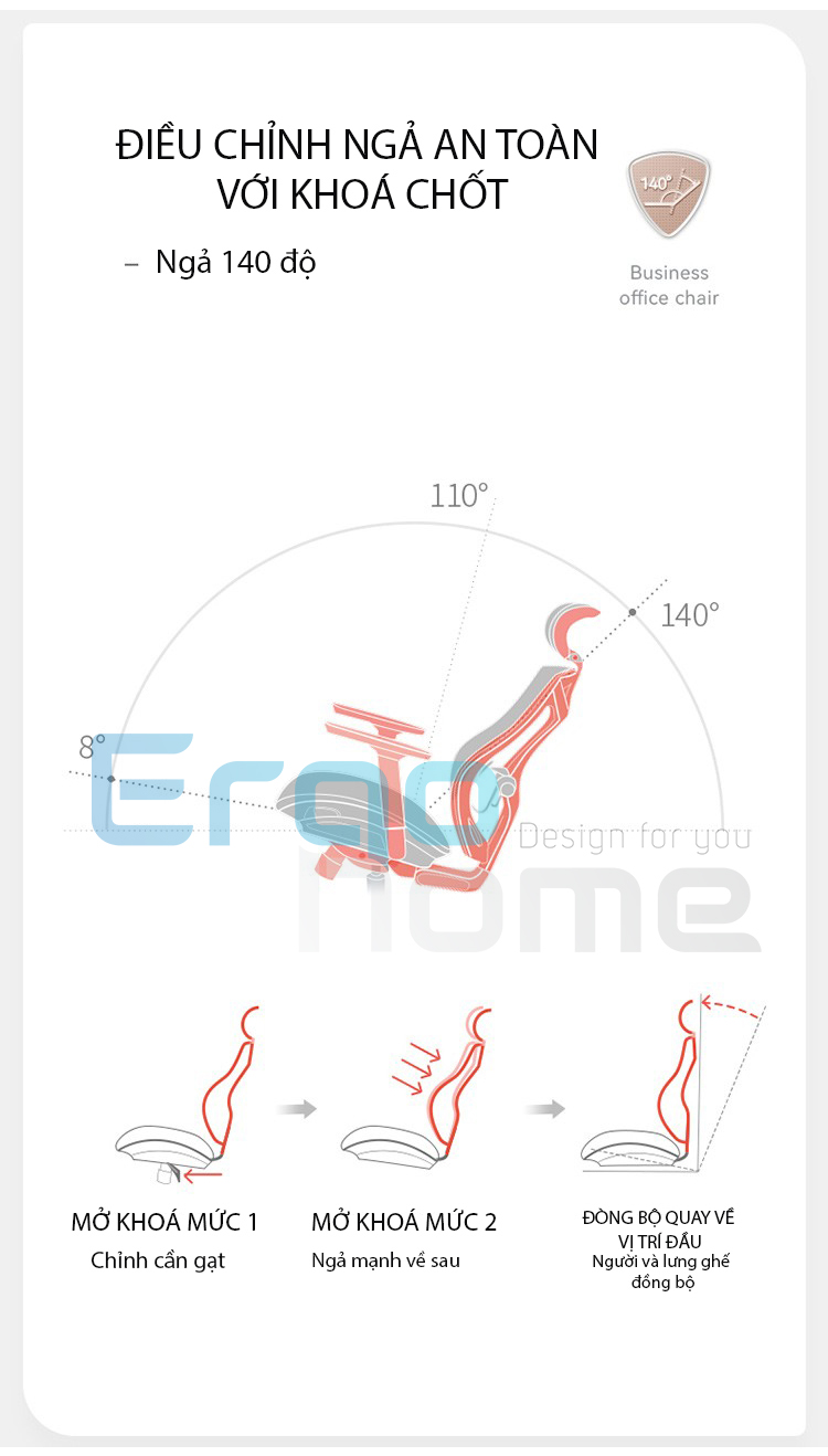 | Độ ngả | 140 độ | Mâm ghế | Di chuyển ra vào 5cm | ||