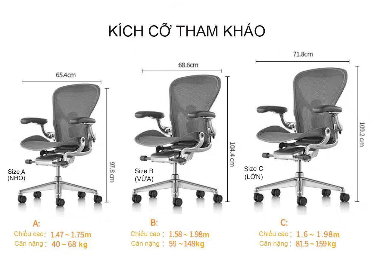 Không chỉ nổi bật về cấu tạo chuẩn, ghế công thái học Herman Miller Aeron ghi điểm bởi được thiết kế 3 size khác nhau. Theo đó, sản phẩm có 3 kích thước nhỏ, vừa, lớn, phù hợp với nhiều đối tượng khách hàng.