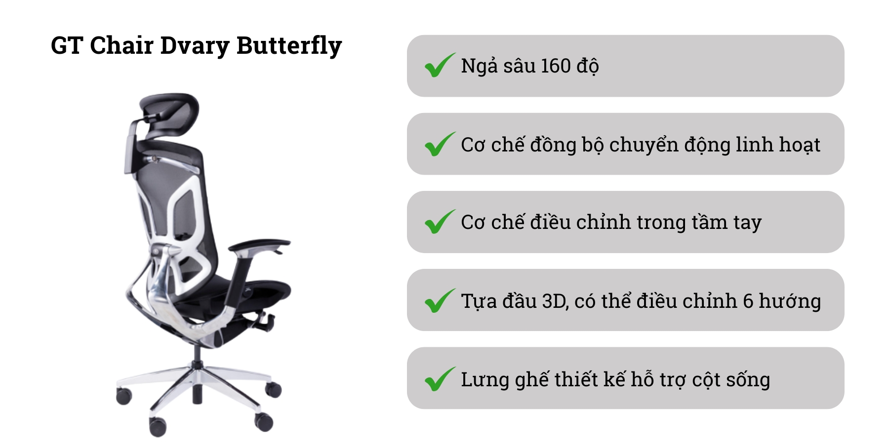 GTChair là thương hiệu nổi tiếng, được đông đảo khách hàng tin tưởng và lựa chọn. Thương hiệu này có hai dòng sản phẩm nổi bật mới ra mắt gần đây là Butterfly và Butterfly Pro, đều được phân phối chính hãng tại Việt Nam bởi Ergohome. Cả hai mẫu ghế này đều hướng đến đối tượng người dùng văn phòng, đặc biệt là những người phải ngồi làm việc trong thời gian dài, cần sự hỗ trợ tối ưu cho cột sống và tư thế ngồi.